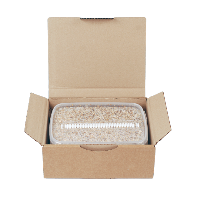 • 1x grow box – This contains substrate with active mycelium (the cake)